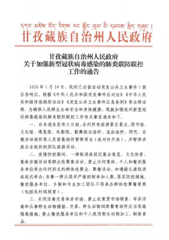 2020年1月24日,我州已全面啟動突發(fā)公共衛(wèi)生事件I級應(yīng)急響應(yīng)。根據(jù)《中華人民共和國突發(fā)事件應(yīng)對法》《中華人民共和國傳染病防治法》《突發(fā)公共衛(wèi)生事件應(yīng)急條例》等法律法規(guī),為確保人民群眾生命安全和身體健康,現(xiàn)就加強我州新型冠狀病毒感染的肺炎聯(lián)防聯(lián)控工作有關(guān)事宜通告如下。一、自本通告發(fā)布之日起,全州所有旅游景區(qū)景點、圖書館、文化館、博覽館、電影院、歌舞娛樂場所、洗浴場所、網(wǎng)吧、宗教活動場所等人員密集場所暫停營業(yè)(或?qū)ν忾_放),并暫停涉旅企業(yè)組織的團隊旅游活動。二、疫情防控期間,一律取消或延遲集會展覽、文化體育、集體宗教活動等群眾性聚集活動。禁止任何集體、個人和餐飲服務(wù)單位舉辦任何形式的群體性聚會、聚餐活動。如遇婚禮請取消或延遲舉辦;喪事一律從簡并嚴格控制參加人數(shù)、落實防控措施。餐飲服務(wù)單位、鄉(xiāng)廚和專業(yè)加工團隊不得承辦群體性聚餐宴席(包括農(nóng)村壩壩宴)。三、關(guān)閉活禽交易宰殺市場,禁止在集貿(mào)市場銷售、宰殺活禽和從事野生動物捕獵、交易,野生動物飼養(yǎng)繁育場所應(yīng)當實施隔離措施,禁止餐飲服務(wù)單位和個人使用野生動物加工、制售食品。四、嚴格執(zhí)行政府依法制定的價格干預(yù)措施和緊急措施,對假冒偽劣、惡意搶購、囤積居奇、哄抬物價等不法行為依法從嚴查處。五、廣大社會公眾要提高警惕,支持并參與愛國衛(wèi)生運動,做好個人防護,搞好居家消毒,減少外出和走親訪友,主動報告涉及疫情傳播隱患的一切線索。1月10日以后,有過湖北等疫區(qū)旅居史的,請即刻報告所在地村委會(社區(qū))登記備案,自返鄉(xiāng)(進州)之日起居家隔離觀察14天,并進行早晚體溫監(jiān)測記錄和核驗;一旦出現(xiàn)發(fā)熱、乏力、呼吸困難、呼吸道感染(干咳為主)等癥狀,請立即佩戴口罩就近到當?shù)蒯t(yī)療機構(gòu)發(fā)熱門診就診。六、州域內(nèi)所有單位和個人,必須接受衛(wèi)生行政主管部門或有關(guān)機構(gòu)的傳染病調(diào)查檢測、采集樣本等預(yù)防措施;病人、疑似病人和傳染病病人密切接觸者應(yīng)當積極配合接受隔離治療、醫(yī)學觀察等控制措施,并如實提供有關(guān)情況。對拒絕配合的,公安機關(guān)將依法協(xié)助強制執(zhí)行;對妨害執(zhí)行公務(wù)的,公安機關(guān)將依法從嚴從重處理。七、嚴禁任何單位和個人發(fā)布不實信息,對有造謠、傳謠等違法行為的,公安機關(guān)將依法嚴厲查處。本通告自發(fā)布之日起施行,終止日期另行通告。