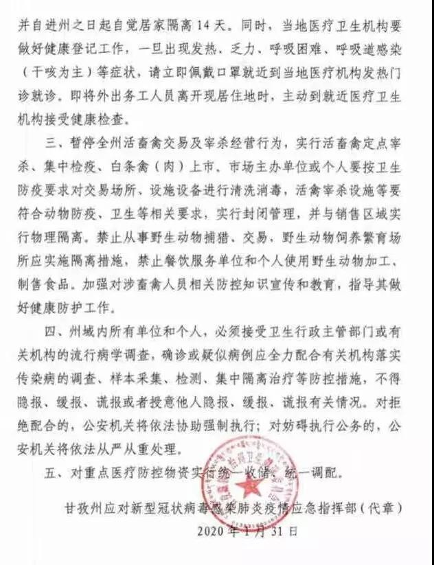 一、暫停各類群體性聚集活動。具有交叉感染風(fēng)險的經(jīng)營單位,如歌舞娛樂、電影院、游戲游藝、洗浴場所、互聯(lián)網(wǎng)上網(wǎng)服務(wù)場所、營業(yè)性麻將場所和兒童游樂設(shè)施、健身房、室內(nèi)游泳場(館)等暫停營業(yè),景區(qū)景點、文化館、圖書館、博覽館、宗教活動場所暫停對外開放,暫停涉旅企業(yè)組織的團(tuán)隊旅游活動。暫時禁止群體性聚餐(含農(nóng)村自辦群體性宴席)。廣大公眾應(yīng)正確佩戴口罩,自覺將廢棄口罩進(jìn)行毀損并按有害垃圾處置。二、加強(qiáng)村(社區(qū))網(wǎng)格化管理,對可能的傳染源要找得到、管得住、服務(wù)好。發(fā)熱病人以及來自疫區(qū)人員應(yīng)積極配合村(社區(qū))的排查檢疫工作安排。凡2020年1月10日以來,來自湖北或有過湖北等疫區(qū)旅居史的,請即刻報告所在村委會(社區(qū))登記備案,并自進(jìn)州之日起自覺居家隔離14天。同時,當(dāng)?shù)蒯t(yī)療衛(wèi)生機(jī)構(gòu)要做好健康登記工作,一旦出現(xiàn)發(fā)熱、乏力、呼吸困難、呼吸道感染(干咳為主)等癥狀,請立即佩戴口罩就近到當(dāng)?shù)蒯t(yī)療機(jī)構(gòu)發(fā)熱門診就診。即將外出務(wù)工人員離開現(xiàn)居住地時,主動到就近醫(yī)療衛(wèi)生機(jī)構(gòu)接受健康檢查。三、暫停全州活畜禽交易及宰殺經(jīng)營行為,實行活畜禽定點宰殺、集中檢疫、白條禽(肉)上市。市場主辦單位或個人要按衛(wèi)生防疫要求對交易場所、設(shè)施設(shè)備進(jìn)行清洗消毒,活禽宰殺設(shè)施等要符合動物防疫、衛(wèi)生等相關(guān)要求,實行封閉管理,并與銷售區(qū)域?qū)嵭形锢砀綦x。禁止從事野生動物捕獵、交易,野生動物飼養(yǎng)繁育場所應(yīng)實施隔離措施,禁止餐飲服務(wù)單位和個人使用野生動物加工、制售食品。加強(qiáng)對涉畜禽人員相關(guān)防控知識宣傳和教育,指導(dǎo)其做好健康防護(hù)工作。四、州域內(nèi)所有單位和個人,必須接受衛(wèi)生行政主管部門或有關(guān)機(jī)構(gòu)的流行病學(xué)調(diào)查,確診或疑似病例應(yīng)全力配合有關(guān)機(jī)構(gòu)落實傳染病的調(diào)查、樣本采集、檢測、集中隔離治療等防控措施,不得隱報、緩報、謊報或者授意他人隱報、緩報、謊報有關(guān)情況。對拒絕配合的,公安機(jī)關(guān)將依法協(xié)助強(qiáng)制執(zhí)行;對妨礙執(zhí)行公務(wù)的,公安機(jī)關(guān)將依法從嚴(yán)從重處理。五、對重點醫(yī)療防控物資實行統(tǒng)一收儲、統(tǒng)一調(diào)配。甘孜州應(yīng)對新型冠狀病毒感染肺炎疫情應(yīng)急指揮部