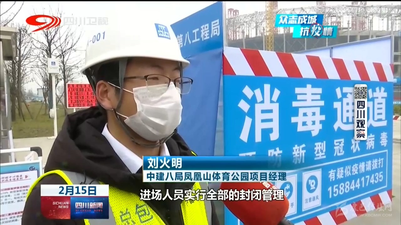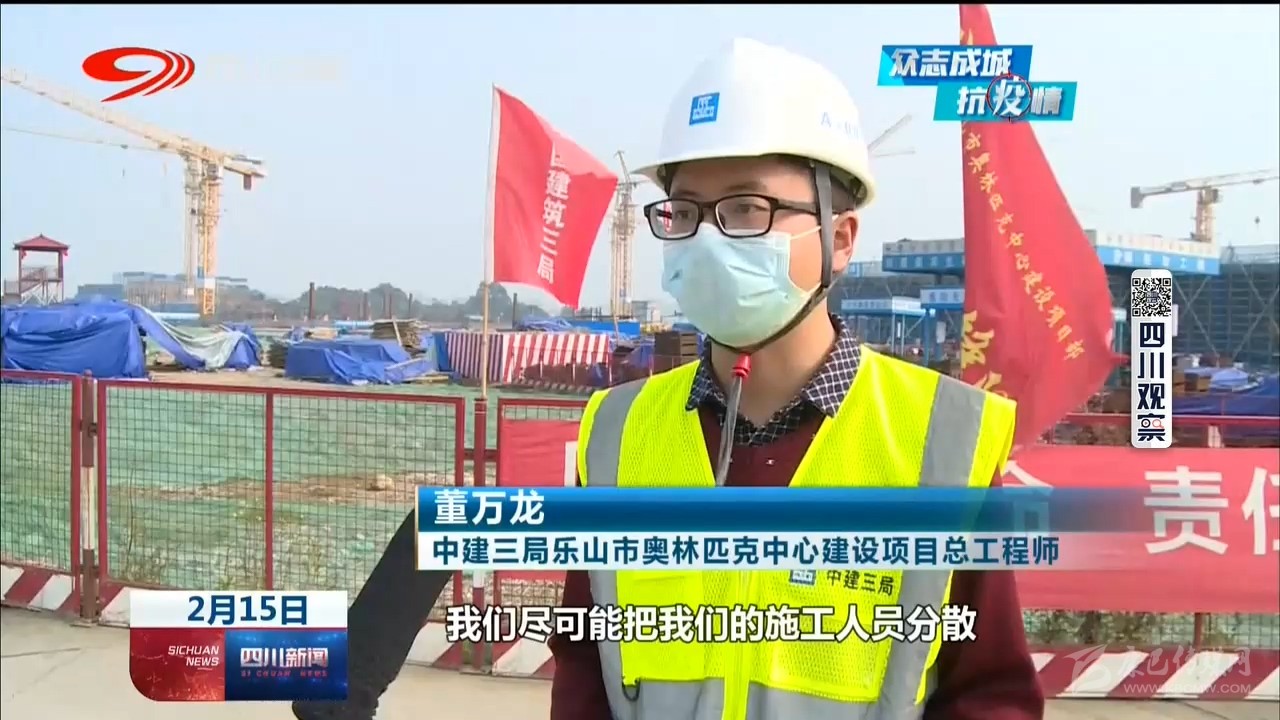 中建三局樂山市奧林匹克中心建設項目總工程師 董萬龍:“我們盡可能把我們的施工人員分散,不要聚集,對內(nèi)我們做好防控物資的保障,口罩、消毒水以及酒精這些防疫物資已經(jīng)齊全?!?/p>