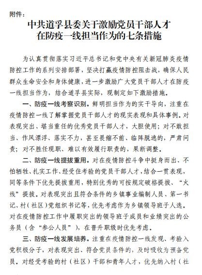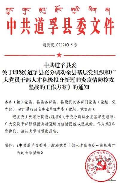 疾風(fēng)知勁草,板蕩識誠臣。自新型冠狀病毒肺炎疫情防控阻擊戰(zhàn)打響以來,道孚縣各級黨組織和黨員、干部主動擔(dān)當(dāng)作為,積極投入疫情防控最前線,為有力防控疫情蔓延作出重要貢獻(xiàn)。近日,道孚縣委印發(fā)《中共道孚縣委關(guān)于激勵黨員干部人才在防疫一線擔(dān)當(dāng)作為的七條措施》,關(guān)心關(guān)愛、激勵引導(dǎo)廣大黨員、干部、各類人才在疫情防控一線履職盡責(zé)、擔(dān)當(dāng)作為、安心戰(zhàn)斗。