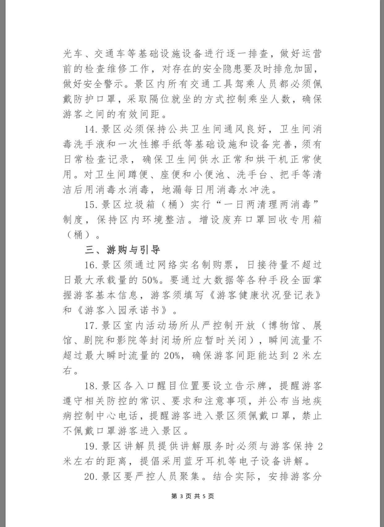 保障游客安全事無巨細(xì)?!吨改稀诽岢?,景區(qū)須通過網(wǎng)絡(luò)實(shí)名制購票,日接待量不超過日最大承載量的50%。景區(qū)要通過大數(shù)據(jù)等各種手段全面掌握游客基本信息,游客須填寫《游客健康狀況登記表》和《游客入園承諾書》。景區(qū)室內(nèi)活動場所從嚴(yán)控制開放(博物館、展館、劇院和影院等封閉場所應(yīng)暫時(shí)關(guān)閉),瞬間流量不超過最大瞬時(shí)流量的20%,確保游客間距能達(dá)到2米左右。此外,景區(qū)講解員提供講解服務(wù)時(shí)必須與游客保持2米左右的距離,提倡采用藍(lán)牙耳機(jī)等電子設(shè)備講解,并嚴(yán)控人員聚集,結(jié)合實(shí)際,安排游客分時(shí)段、間隔入園,實(shí)行分散式游覽。