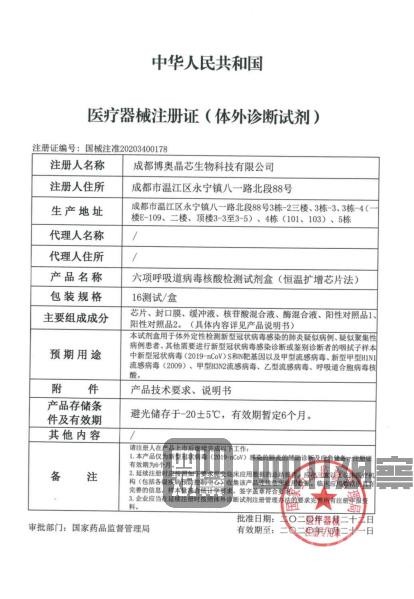 2月22日,國家藥品監(jiān)督管理局應(yīng)急審批通過3個(gè)新型冠狀病毒檢測產(chǎn)品,其中之一的“六項(xiàng)呼吸道病毒核酸檢測試劑盒”就是鐘院士提到的試劑,而它則是由位于成都溫江的企業(yè)——博奧生物聯(lián)合清華大學(xué)、四川大學(xué)華西醫(yī)院共同設(shè)計(jì)開發(fā)的。這款產(chǎn)品正在迅速應(yīng)用到疫情防控前線,為一線提供快速、精準(zhǔn)、有效診斷。