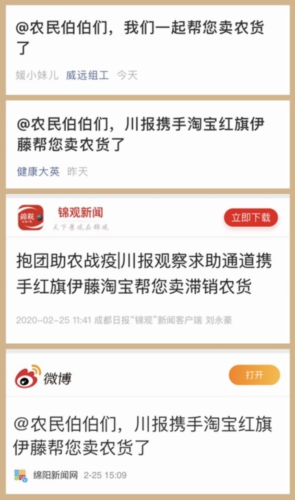 多地市州媒體及縣級融媒體中心的關注積極響應參與活動?!熬W(wǎng)信四川”公眾號、南充日報“南充見”、成都日報錦觀、眉山在線、開江發(fā)布、直播鹽亭、綿陽新聞網(wǎng)、宜賓日報、威遠組工、健康大英等均及時對活動相關信息進行了發(fā)布,及時把抱團助農(nóng)戰(zhàn)疫活動信息帶給當?shù)赜行枨蟮霓r(nóng)戶。