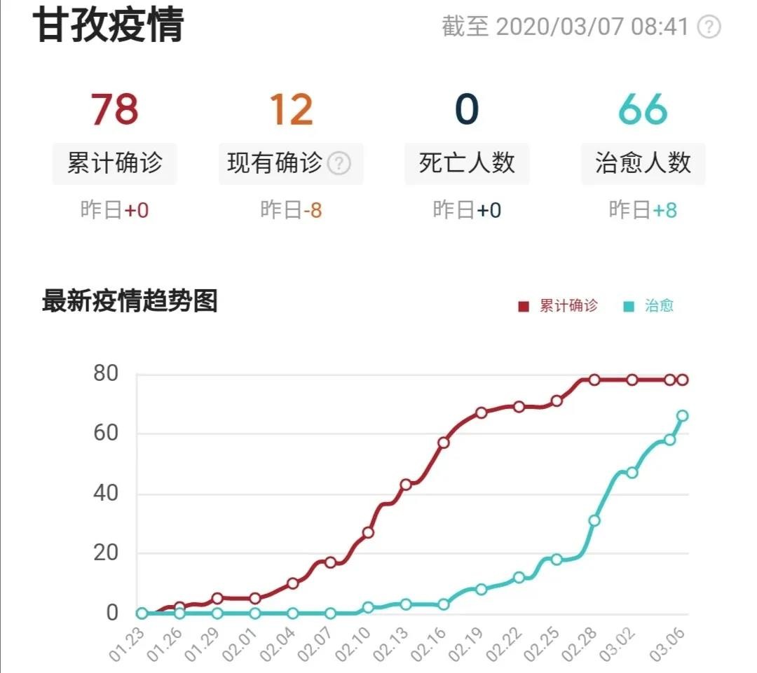 截至3月6日24時(shí),我州累計(jì)報(bào)告確診病例78例,累計(jì)治愈出院66人(道孚縣61人、康定市2人、色達(dá)縣2人、稻城縣1人),其余12人均在定點(diǎn)醫(yī)院隔離治療,25名密切接觸者正在接受醫(yī)學(xué)觀察。我州道孚縣連續(xù)8天無(wú)確診病例報(bào)告,其余17個(gè)縣(市)連續(xù)32天無(wú)確診病例報(bào)告。