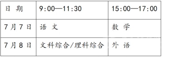 全省高考(一類(lèi)模式高考除外)于7月7、8日統(tǒng)一組織進(jìn)行。各科目考試時(shí)間(北京時(shí)間)安排如下: