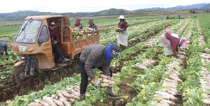 一根根白蘿卜,從理塘縣的沙礫地里,被農(nóng)牧民拔出來,被迅速清洗、包裝,及時裝上排隊等候的冷鏈車。過雅江,翻折多山、二郎山,在雪域高原行駛四百公里后,抵達(dá)川西平原,再上成渝環(huán)線高速,后經(jīng)廈蓉高速,抵達(dá)珠海、深圳,進入香港、澳門市場。
