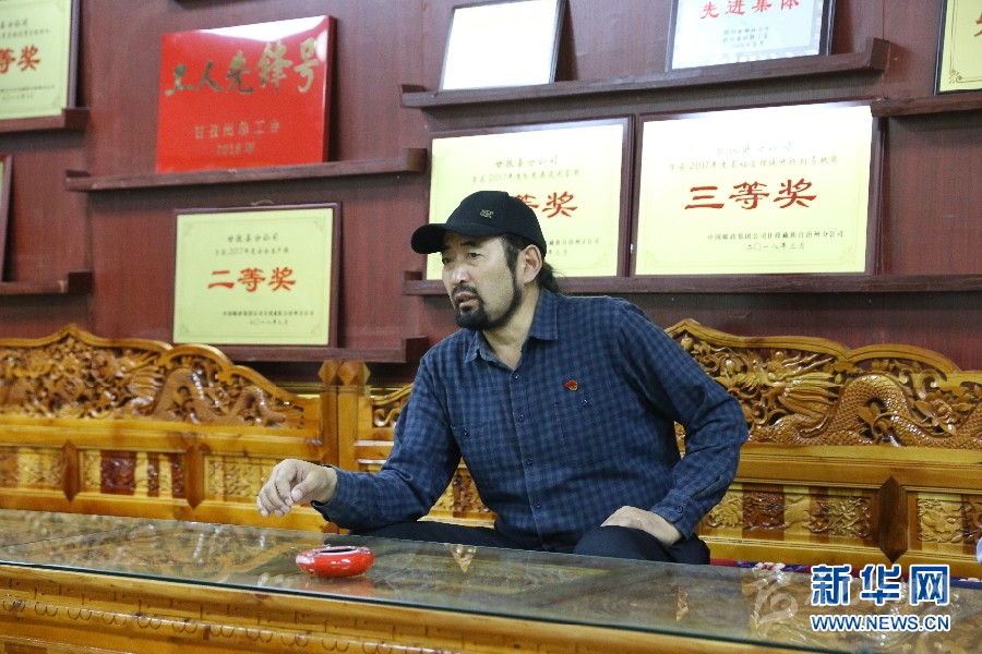 (其美多吉接受采訪,背后的墻上掛滿他和集體的各項(xiàng)榮譽(yù)。 新華網(wǎng) 曹鵬 攝)