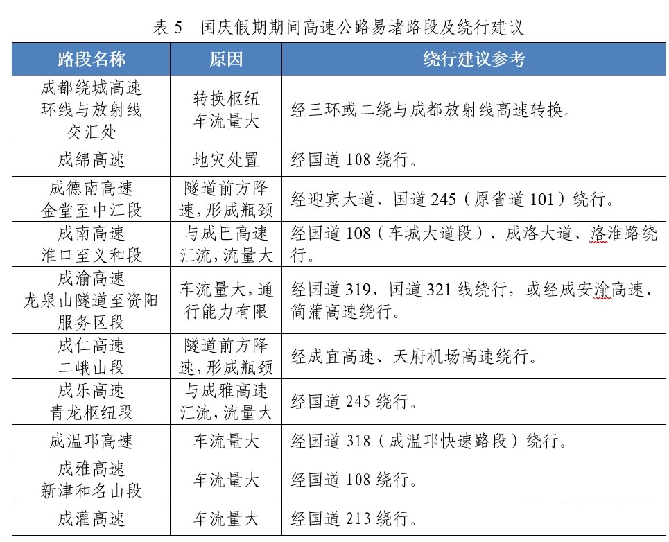 成都周邊高速出現(xiàn)擁堵可能性較大。成都繞東高速日均流量約19.02萬輛,遠超設(shè)計流量。成溫邛、成都繞西、成雅、成彭、成南高速流量也將大幅提升,日均流量均超過10萬輛。此外,渝蓉、成綿、成灌等方向的路段車流量也較平日車流量增加明顯。