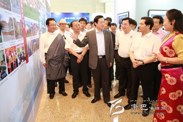 6月8日上午10時,劉奇葆、王正偉來到民族文化宮,首先走進四川甘孜藏區(qū)發(fā)展成就暨旅游圖片展現(xiàn)場。這里,展示的是甘孜藏區(qū)經(jīng)濟社會發(fā)展成就、自然風光、歷史文化、民族風情、田園藏寨等方面內容的圖片。一幅幅圖片,一個個場景,劉奇葆都非常熟悉。在四川工作期間,他曾十幾次奔赴甘孜藏區(qū)考察,足跡遍布全州18個縣。劉奇葆仔細觀看展示圖片,并不時詢問交通通信、優(yōu)勢產(chǎn)業(yè)等發(fā)展情況以及民生改善的情況。劉奇葆說,甘孜山川秀美,民族風情濃郁,是一方充滿生機和活力的土地,希望甘孜立足自身實際,大力發(fā)展農(nóng)牧業(yè)和文化旅游業(yè),大力加強生態(tài)建設和環(huán)境保護,大力改善民生,努力走出藏區(qū)科學發(fā)展、跨越發(fā)展之路。