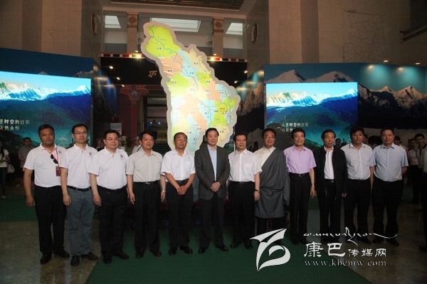 在一幅巨大的貢嘎云海風光圖片前,劉奇葆興致勃勃地與陪同視察的領(lǐng)導合影留念。