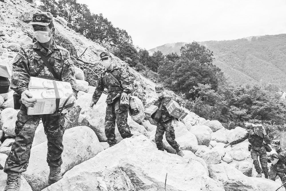 在地震發(fā)生后的48小時內(nèi),救援隊伍拼盡全力在水流湍急的河面搭設(shè)便橋,在不可能通行的地方,奮力開辟出一條生命通道,一箱箱應急救援物資靠肩扛人背送往共和村,部分急需轉(zhuǎn)移的鄉(xiāng)親被一支支救援隊伍及時送到安全地帶,妥善安置。