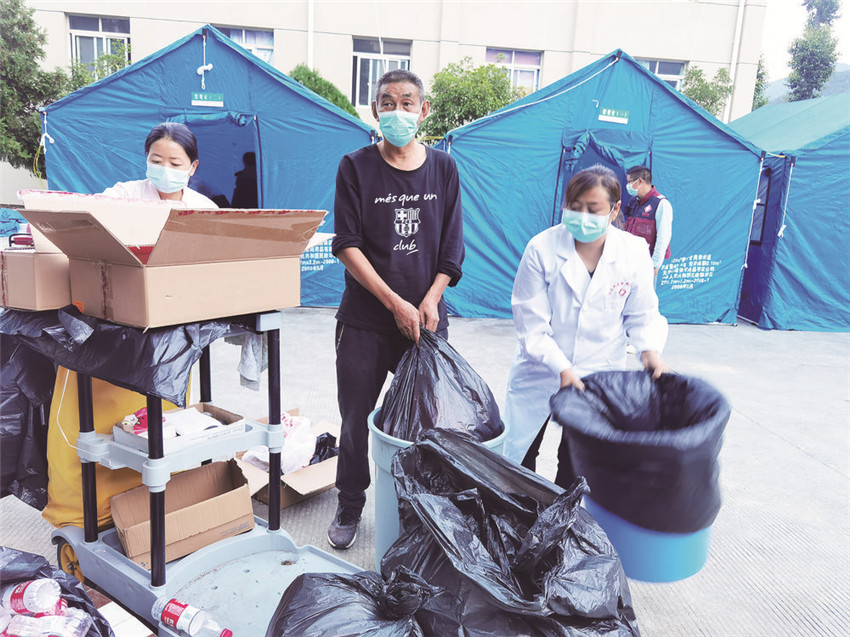 傷員多、搶救頻,大量傷員及家屬的聚集導(dǎo)致醫(yī)院醫(yī)療垃圾和生活垃圾量大增,醫(yī)療垃圾是平時的三四倍,生活垃圾更是以往的十倍。為了保持清潔,祝錫琴隨時關(guān)注著接診點,只要有垃圾就立刻清除。后來,垃圾太多,一個人無能為力,祝錫琴又叫來了兒子齊秦做志愿者,協(xié)助清除垃圾。