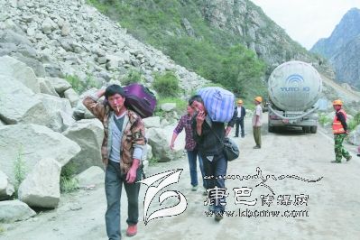 連續(xù)降雨造成省道211線多處垮塌,位于211線上的孔玉鄉(xiāng)路、水、電、通訊全部中斷,水電礦山企業(yè)停產(chǎn),近萬人受困,出入困難,食物緊缺,已成為“孤島”。在接近孔玉鄉(xiāng)的省道211線三碉垮塌處,不斷有山石滾落,一些急于出門的群眾,翻山越嶺,通過吊索的方式出行,情況非常危險。益西達瓦一行冒著隨時從山上滾落的山石,徒步趕到垮塌現(xiàn)場,通過對講機與在山上幫助群眾出行的孔玉鄉(xiāng)鄉(xiāng)長代學華通話,要求他確保安全,盡量勸阻群眾不要冒險出行。