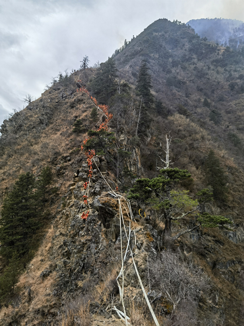 一難——懸崖絕壁險(xiǎn),人工作業(yè)難。火場(chǎng)位于稻城縣東義河左岸,呈東西走向的高山峽谷間,溝壑縱橫、溝窄林密、坡陡谷深,絕大部分坡度在70度以上,距起火點(diǎn)海拔3840米、起火點(diǎn)至河面高差近1600米;到起火點(diǎn)僅有一條狹窄道路沿陡峭山脊艱難通行,可謂“華山一條路,登臨猶比上天難”,人工作業(yè)極其困難。