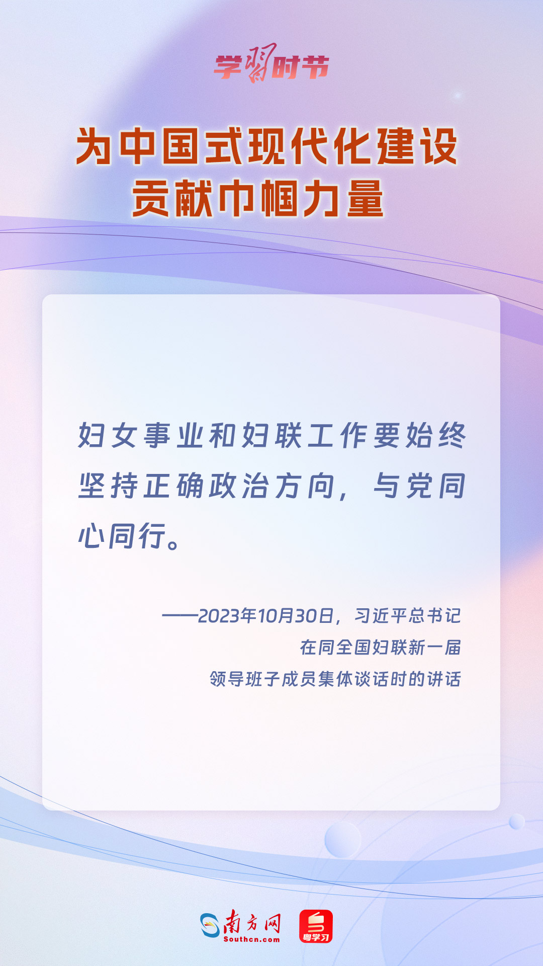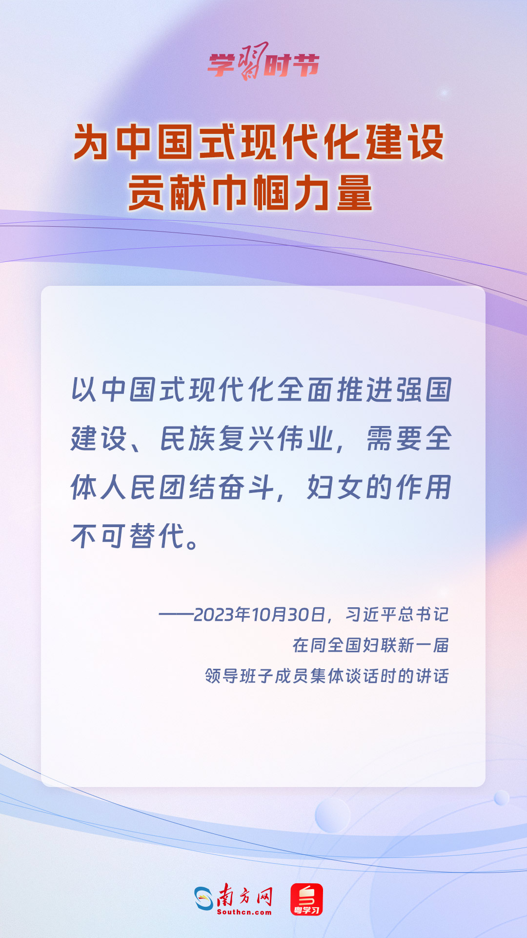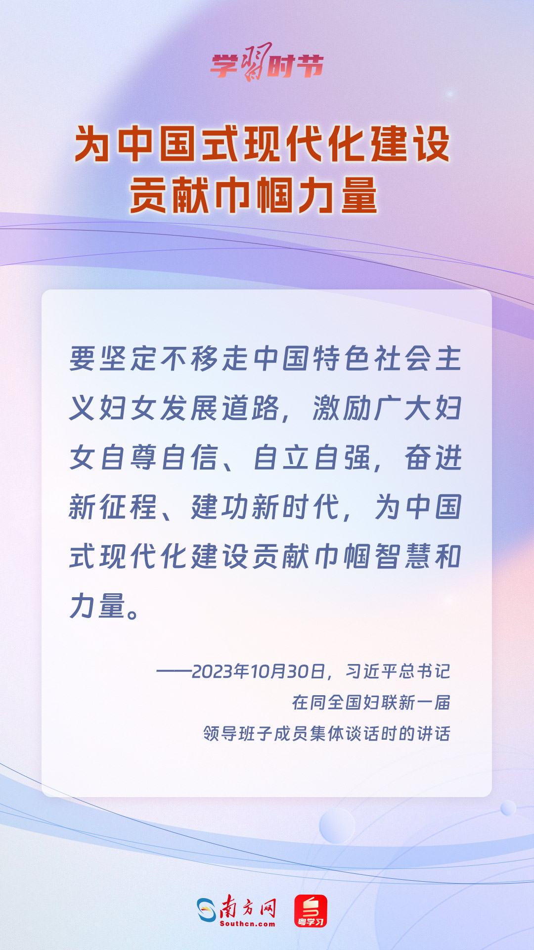 10月30日,中共中央總書記、國(guó)家主席、中央軍委主席習(xí)近平在中南海同全國(guó)婦聯(lián)新一屆領(lǐng)導(dǎo)班子成員集體談話并發(fā)表重要講話,讓我們一同學(xué)習(xí)。
