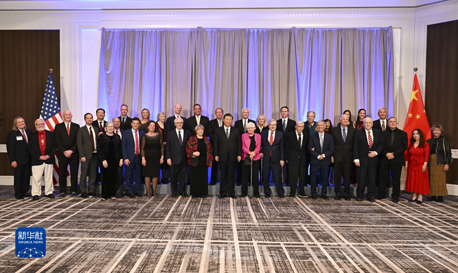 當(dāng)?shù)貢r(shí)間11月15日晚,國(guó)家主席習(xí)近平在美國(guó)舊金山出席美國(guó)友好團(tuán)體聯(lián)合舉行的歡迎宴會(huì)。這是宴會(huì)開(kāi)始前,習(xí)近平會(huì)見(jiàn)飛虎隊(duì)和史迪威將軍后人、鼓嶺、艾奧瓦州、華盛頓州等方面友好人士代表,同他們親切交談并合影留念。新華社記者 謝環(huán)馳 攝 圖片來(lái)源:新華網(wǎng)