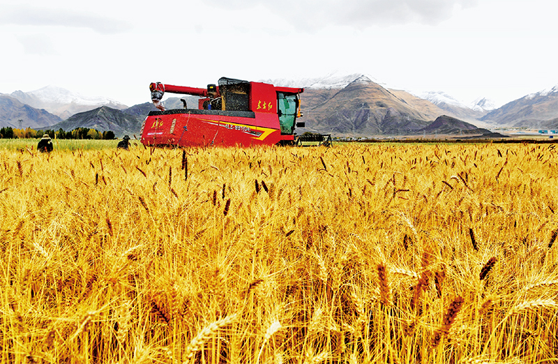 近年來,西藏自治區(qū)積極實施耕地改造,通過開展高標準農田建設,全方位提升耕地質量與糧食產量,夯實糧食安全基礎。圖為工作人員駕駛農業(yè)機械在拉薩市林周縣曲果強村的高標準農田里收獲小麥(2023年10月12日攝)。 新華社記者 張汝鋒/攝