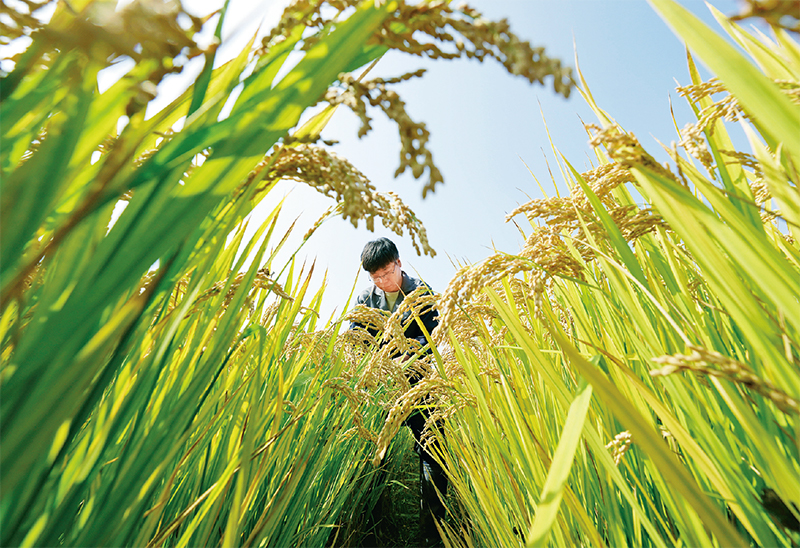 近年來,河北省唐山市通過鹽堿地土壤科學改良、耐堿作物品種培育、適用耕作技術研究應用等系列治理措施,在鹽堿地上開發(fā)建設了高標準農田88.6萬畝,有效提高鹽堿地利用水平。圖為2023年10月11日,農業(yè)科研人員在唐山市曹妃甸區(qū)第五農場鹽堿地改良而成的高標準稻田內工作。 新華社記者 楊世堯/攝