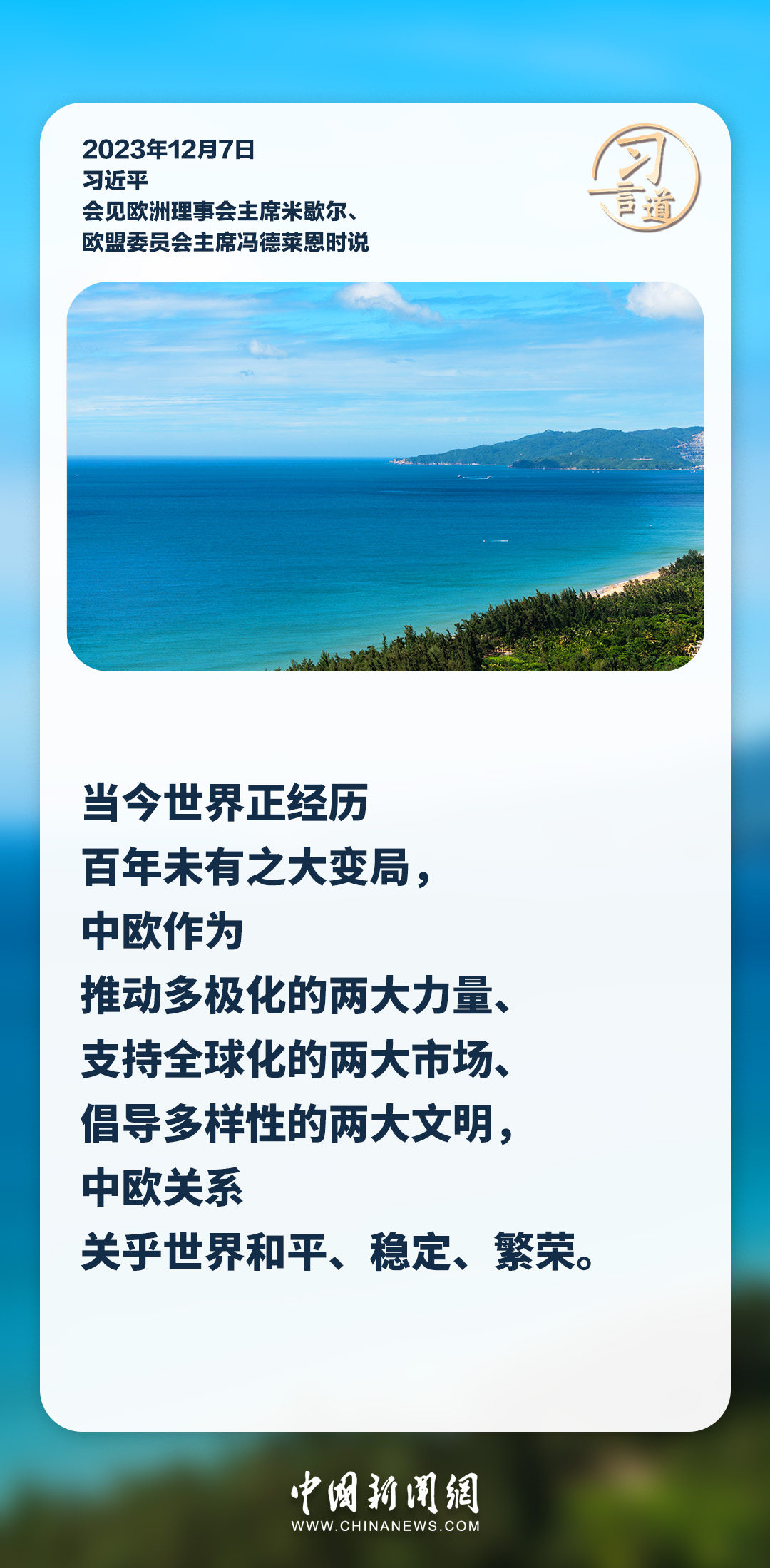 12月7日,國(guó)家主席習(xí)近平在釣魚(yú)臺(tái)國(guó)賓館會(huì)見(jiàn)來(lái)華舉行第二十四次中國(guó)—?dú)W盟領(lǐng)導(dǎo)人會(huì)晤的歐洲理事會(huì)主席米歇爾和歐盟委員會(huì)主席馮德萊恩。習(xí)近平說(shuō)——
