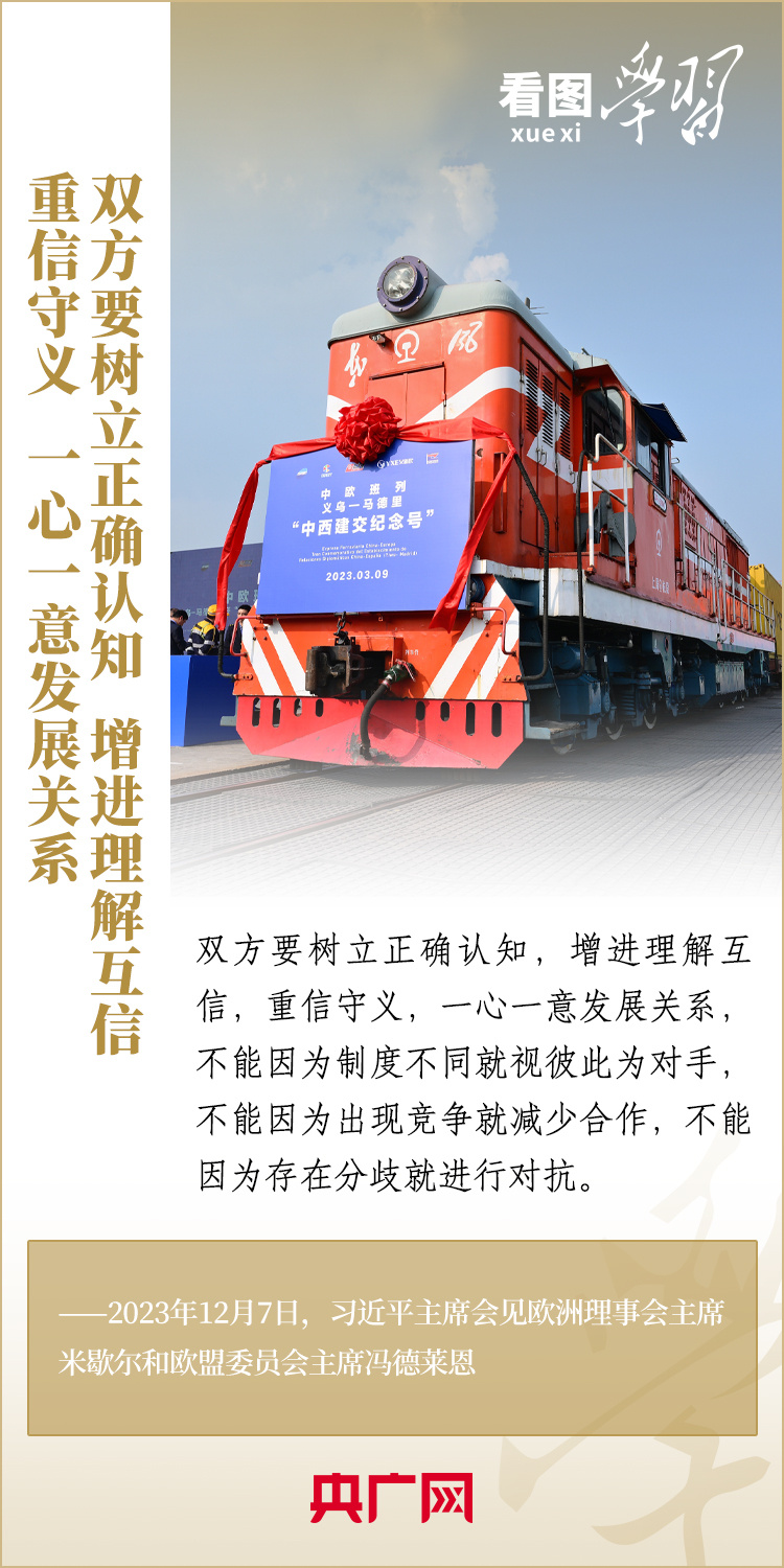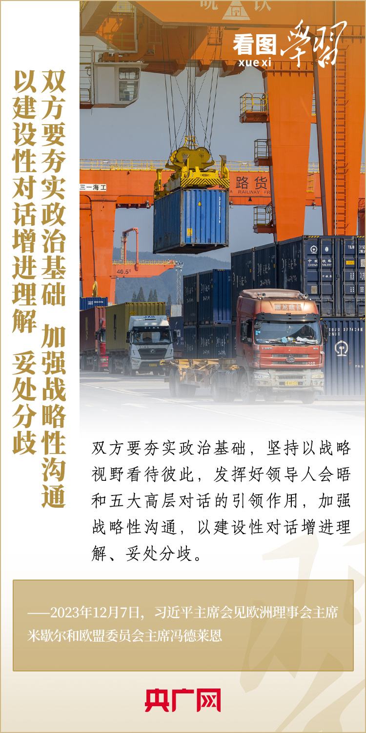 12月7日,國(guó)家主席習(xí)近平會(huì)見(jiàn)來(lái)華舉行第二十四次中國(guó)—?dú)W盟領(lǐng)導(dǎo)人會(huì)晤的歐洲理事會(huì)主席米歇爾和歐盟委員會(huì)主席馮德萊恩,雙方就事關(guān)中歐關(guān)系的戰(zhàn)略性問(wèn)題,以及中歐各領(lǐng)域?qū)υ捄献?、雙方重點(diǎn)關(guān)切、全球治理、國(guó)際和地區(qū)熱點(diǎn)問(wèn)題等深入坦誠(chéng)交換看法,并就一系列問(wèn)題達(dá)成重要共識(shí)。今年是中歐建立全面戰(zhàn)略伙伴關(guān)系20周年,習(xí)主席強(qiáng)調(diào),中歐關(guān)系具有戰(zhàn)略意義和世界影響,關(guān)乎世界和平、穩(wěn)定、繁榮。一起來(lái)學(xué)習(xí)!