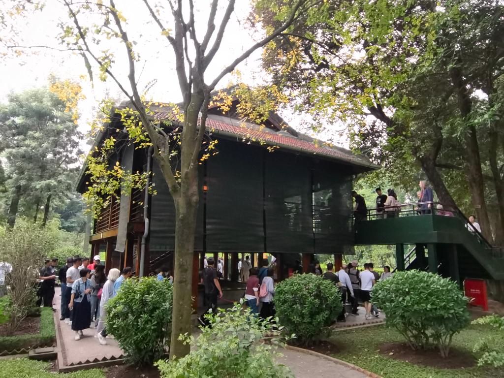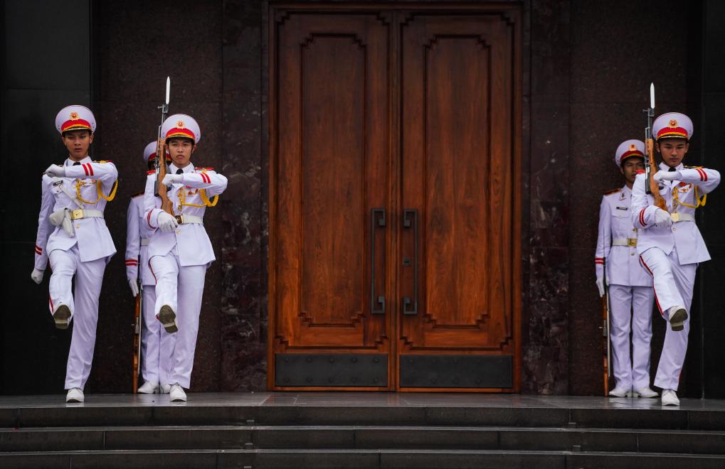 在河內(nèi)地標巴亭廣場一側(cè),坐落著胡志明陵和胡志明故居。記者抵達廣場時,守衛(wèi)胡志明陵的儀仗兵正在舉行換崗儀式,眾多民眾和游客高舉相機或手機,記錄下這莊嚴肅穆的一刻。胡志明陵北側(cè)的胡志明故居內(nèi),各國游客排起長隊,在他曾長期居住和工作的高腳屋下駐足留影。