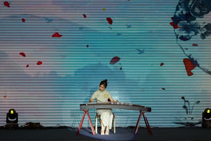 5月20日,第22屆“漢語橋”世界大學(xué)生中文比賽越南北部及中部賽區(qū)決賽中,參賽大學(xué)生表演古箏和太極拳。