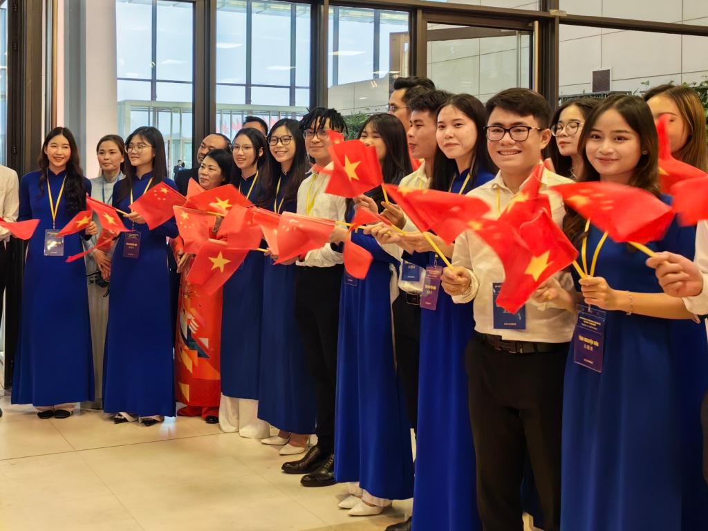 中越友好人士及青年見(jiàn)面會(huì)現(xiàn)場(chǎng)氣氛熱烈,鮮花和兩國(guó)黨旗國(guó)旗交相輝映,匯成一片喜悅的海洋。