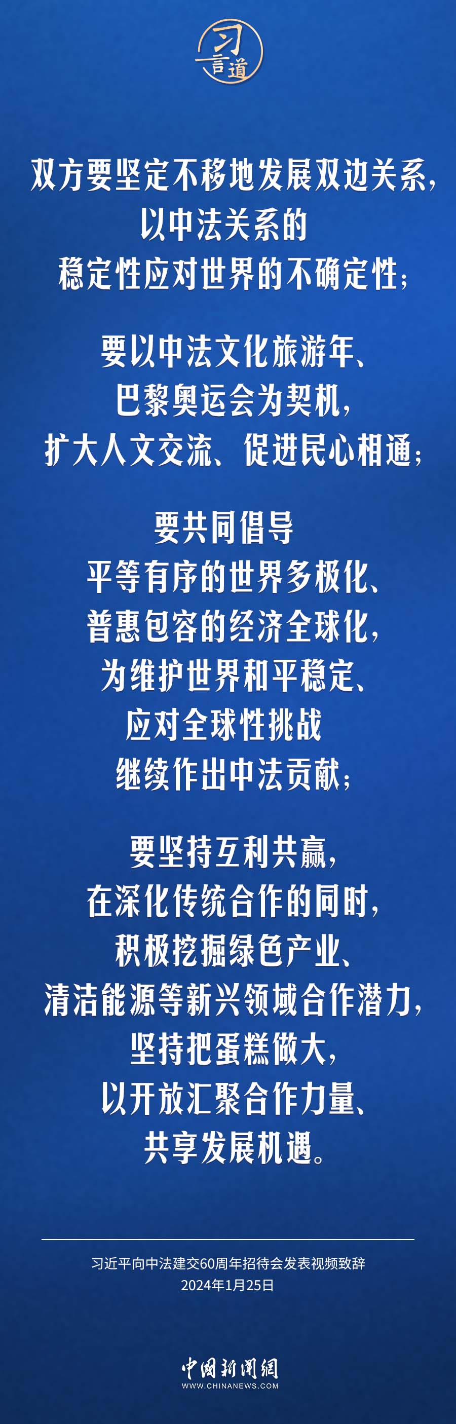 1月25日,中法建交60周年招待會在國家大劇院舉行,國家主席習(xí)近平發(fā)表視頻致辭。習(xí)近平指出——