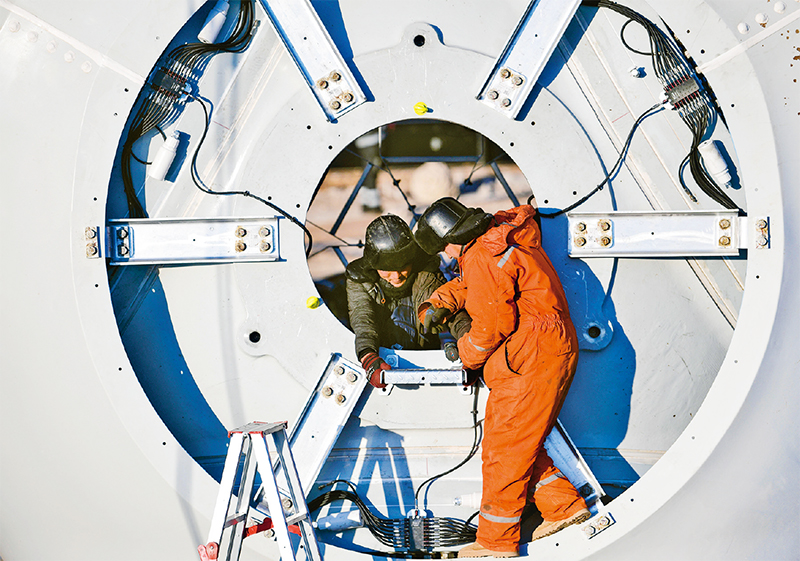 河北承德豐寧風(fēng)光氫儲(chǔ)100萬千瓦風(fēng)光項(xiàng)目是國家“十四五”規(guī)劃的大型清潔能源基地——冀北清潔能源基地的標(biāo)志性工程。項(xiàng)目建成后,預(yù)計(jì)每年可生產(chǎn)綠電18億千瓦時(shí),減少二氧化碳排放約140萬噸。圖為2024年1月12日,該項(xiàng)目的工人在安裝風(fēng)機(jī)輪轂配件。 新華社發(fā) 王立群/攝