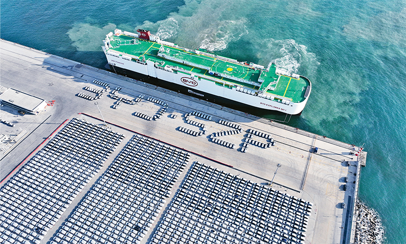 2023年,我國電動(dòng)載人汽車、鋰離子蓄電池和太陽能電池為代表的“新三樣”產(chǎn)品合計(jì)出口首次突破萬億元大關(guān),展現(xiàn)了中國制造的新優(yōu)勢(shì)。圖為2024年1月14日,比亞迪“開拓者1號(hào)”(“BYD EXPLORER NO.1”)滾裝船抵達(dá)深圳港小漠國際物流港。 新華社發(fā)
