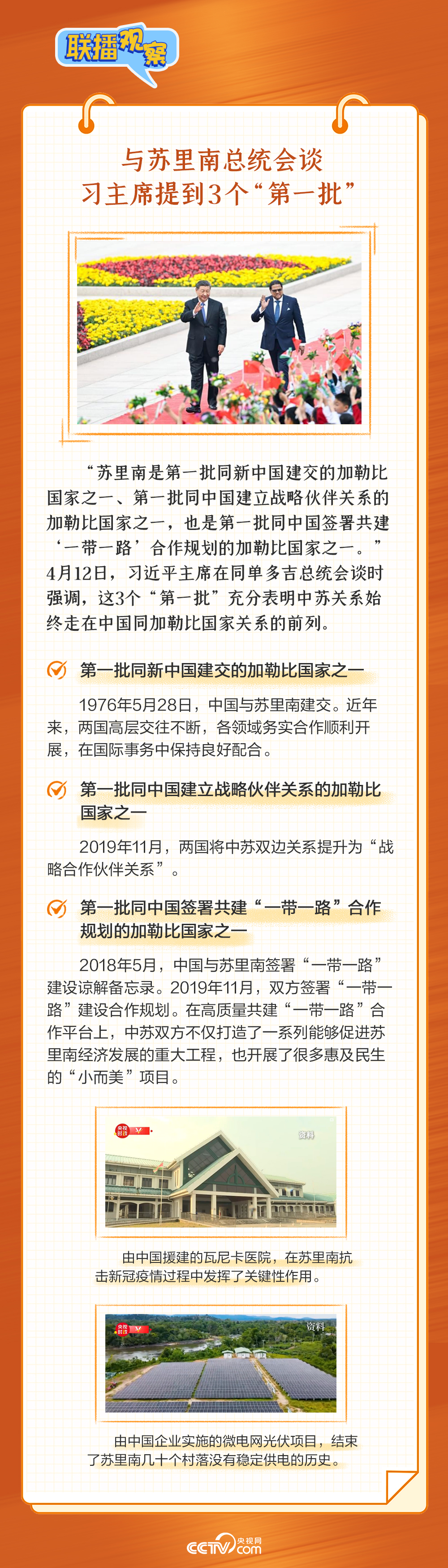 4月12日下午,習(xí)近平主席在北京人民大會(huì)堂同來華進(jìn)行國(guó)事訪問的蘇里南總統(tǒng)單多吉舉行會(huì)談。此前,外交部發(fā)言人曾表示,2024年是中國(guó)同蘇里南建立戰(zhàn)略合作伙伴關(guān)系5周年,中方歡迎單多吉總統(tǒng)在這一特殊時(shí)刻訪華。