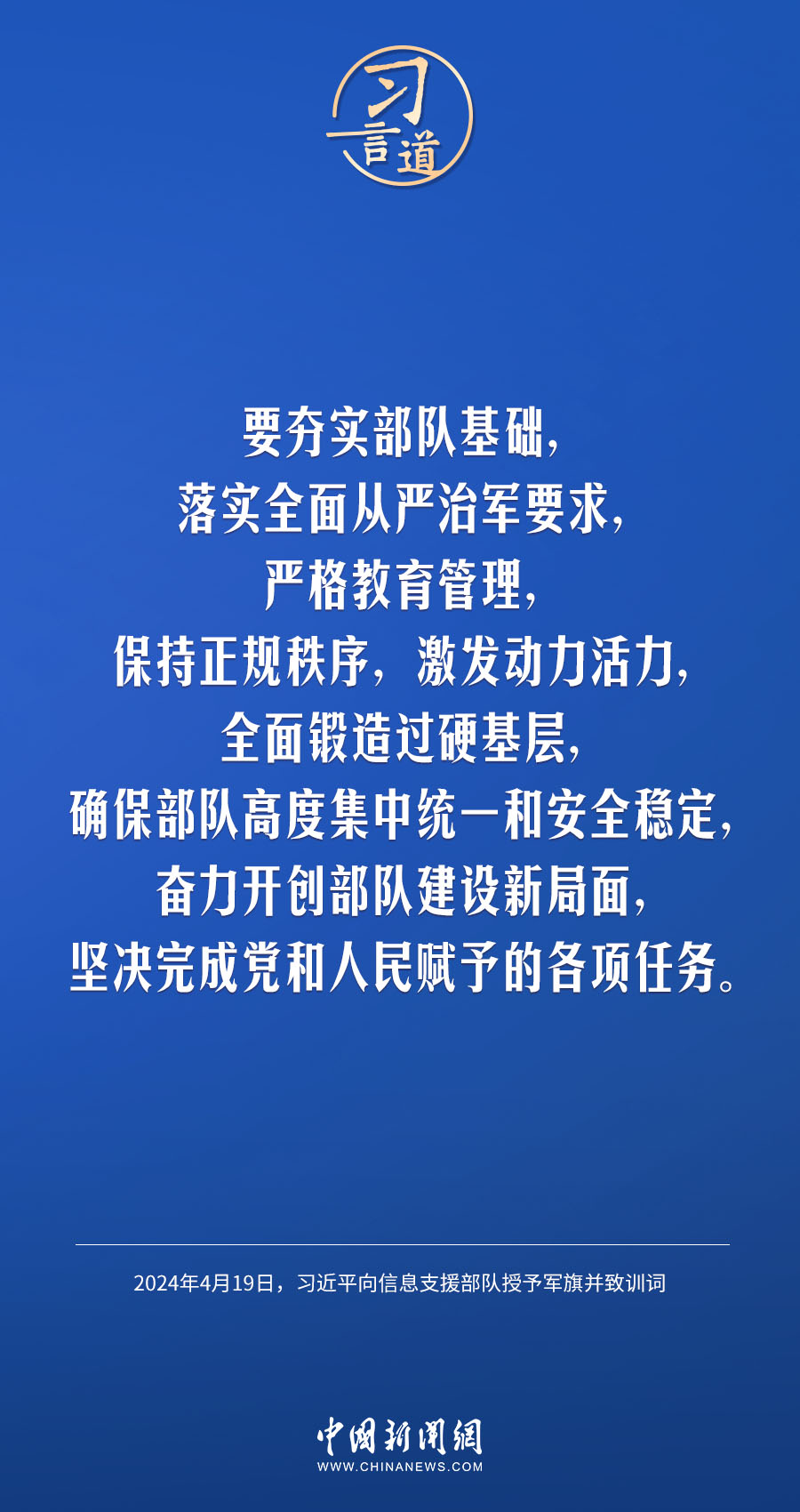 中國人民解放軍信息支援部隊成立大會19日在北京八一大樓隆重舉行。中共中央總書記、國家主席、中央軍委主席習近平向信息支援部隊授予軍旗并致訓詞,代表黨中央和中央軍委向信息支援部隊全體官兵致以熱烈祝賀。他強調——