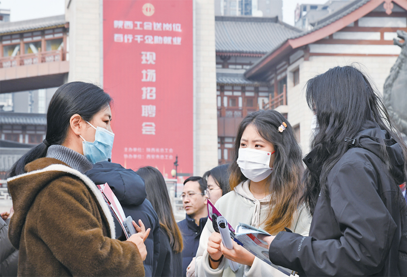 2024年3月6日,由陜西省總工會舉辦的2024年陜西工會“春送崗位”就業(yè)服務月啟動儀式在西安舉行。與啟動儀式同期舉辦的現(xiàn)場招聘會吸引約200家用人單位參加,提供崗位超過5000個。圖為當日求職者在現(xiàn)場招聘會上與企業(yè)工作人員交流。 新華社記者 張博文/攝