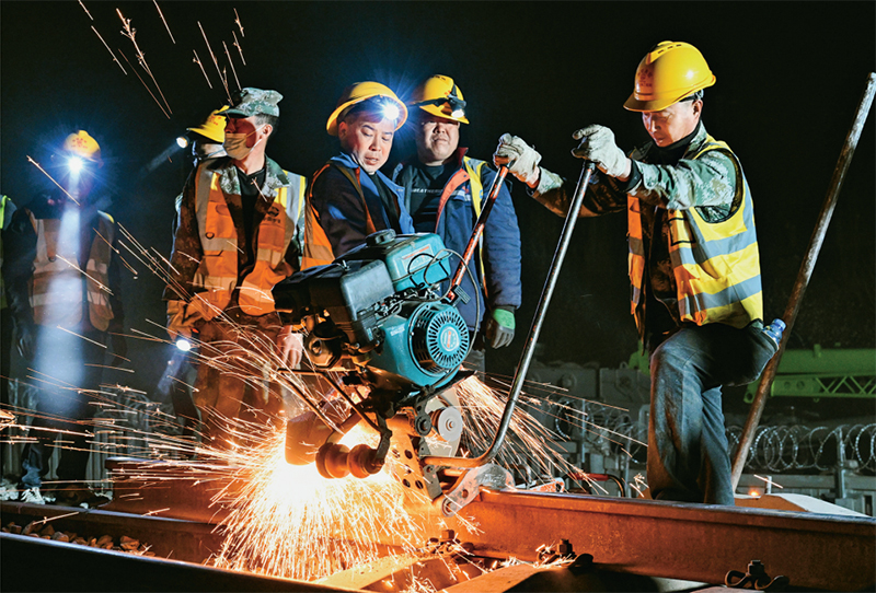 2024年4月10日,在內蒙古包頭市,包銀高鐵引入包頭樞紐工程的關鍵控制性工程之一——包西上行線路撥接完成施工。此次施工完成,標志著包銀高鐵引入包頭樞紐包頭站改造工程取得重大進展,為包銀高鐵開通奠定堅實基礎。圖為4月10日凌晨,工人在包西上行線路上作業(yè)。 新華社記者 劉磊/攝