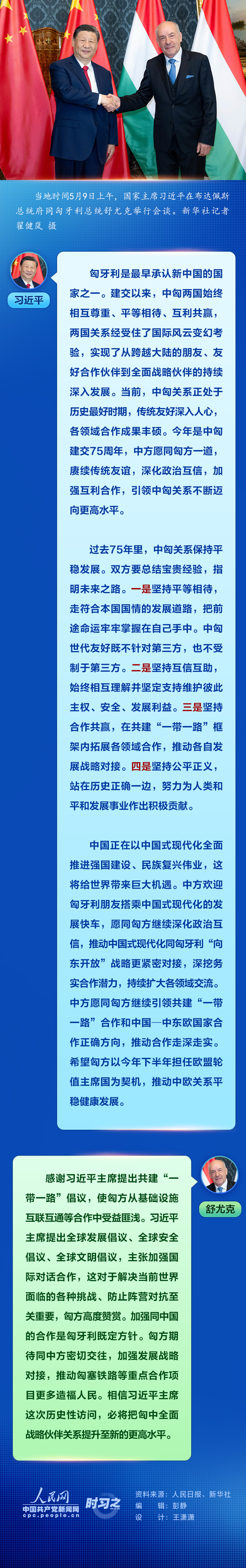當(dāng)?shù)貢r(shí)間5月9日上午,國(guó)家主席習(xí)近平在布達(dá)佩斯總統(tǒng)府同匈牙利總統(tǒng)舒尤克舉行會(huì)談。習(xí)近平指出,今年是中匈建交75周年,中方愿同匈方一道,賡續(xù)傳統(tǒng)友誼,深化政治互信,加強(qiáng)互利合作,引領(lǐng)中匈關(guān)系不斷邁向更高水平。