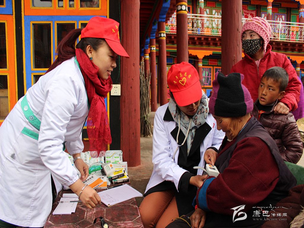 “叔叔,您有高原性心臟病,這是我們?yōu)槟鷾?zhǔn)備的祛風(fēng)濕的藥,每天3次,每次3粒,您還要注意防寒保暖哦……”醫(yī)務(wù)人員為老人們量血壓、聽心音、問病情、送藥品。