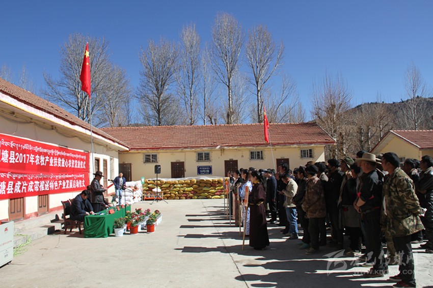 在農(nóng)科所院壩,擺放著縣委政府多方籌資,縣農(nóng)牧和科技局調(diào)運和貯備脫毒馬鈴薯種60萬公斤,青稞良種30萬公斤、農(nóng)膜10噸、肥料120噸、各類蔬菜油菜良種3000公斤,35萬元的黑木耳菌種,分發(fā)給24個鄉(xiāng)鎮(zhèn)、37個脫貧村。為趕這趟“理塘縣2017年農(nóng)牧產(chǎn)業(yè)扶貧放心農(nóng)資發(fā)放儀式”、“理塘縣成片成帶推進特色產(chǎn)業(yè)發(fā)展啟動儀式”,降央吉稱專門起了個大早,開著拖拉機“趕”了兩個小時到了農(nóng)科所。