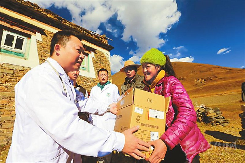 右圖:2016年11月2日,遂寧市中心醫(yī)院派駐康定市人民醫(yī)院的城鄉(xiāng)醫(yī)療對口支援醫(yī)療隊,深入新都橋鎮(zhèn)呷巴鄉(xiāng)自弄村特困戶彭措拉姆(右一)家義診,并向她捐贈了衣物。 (資料圖片)