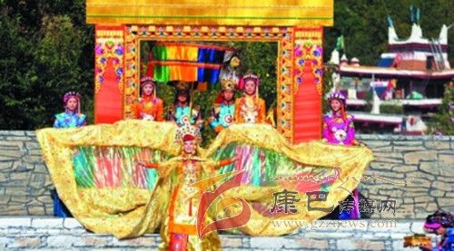 在催人奮進(jìn)的戰(zhàn)鼓聲中,一群身披甲胄的士兵拿著長劍,背著巨弓走到臺前,在鏗鏘的戰(zhàn)鼓聲中,戰(zhàn)士們做著各種競技動作,模仿武士們互相攻擊的樣子,那矯健的身影展示了遠(yuǎn)古時(shí)代嘉絨藏族先民們?yōu)榱松媾c自然努力抗?fàn)幍膱鼍啊_^了一會兒音樂一轉(zhuǎn),戰(zhàn)鼓聲漸漸減弱,在鳥雀的陣陣啾啾聲中,一座木門慢慢的開啟,一位身披長袍、頭戴鳳冠的女王在眾多美女的簇?fù)硐?,緩緩走下臺階步入舞臺中央,此時(shí),一位手捧托盤的老者來到女王面前單膝下跪,將托盤高舉過頂,并邀請女王品嘗佳肴,女王將中指在酒中蘸了蘸,并曲起中指向四周輕輕彈去,寓意愿將杯中美酒與四方百姓同飲。在女王面前還放置著一個(gè)凈水桶,桶中盛滿了清澈的甘泉,桶上橫放著一枝柏樹枝,女王伸出纖纖玉手,拿著柏樹枝在水中蘸了蘸,面向墨爾多神山撒去,寓意向神山祈福。這是此次《美人谷·丹巴》節(jié)目展演中的序曲部分,有著強(qiáng)烈的東女神韻,將遠(yuǎn)古時(shí)代東女國女王遺風(fēng)展演的淋漓盡致。