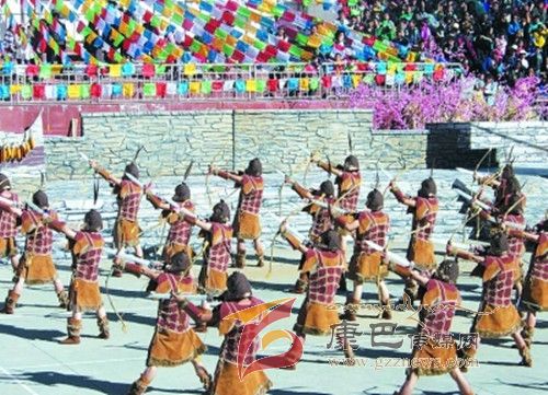 10月26日,在甲居藏寨,處處洋溢著豐收和歡樂的氣氛,人們扶老攜幼,身著節(jié)日的盛裝走到一起,來共同慶祝丹巴嘉絨風(fēng)情節(jié)的順利召開。在一塊空地中,搭建了臨時(shí)的舞臺,看臺上,幾座古碉模型傲然挺立,在不遠(yuǎn)處,一座古碉矗立在一座小山包上,與古碉模型遙相呼應(yīng)、相映成趣。上午9時(shí)40分,當(dāng)節(jié)目主持人宣布嘉絨風(fēng)情節(jié)正式開始時(shí),一束束搖曳的煙花向空中飛去,在空中炸響后,散發(fā)出五顏六色的煙霧,其中有的還幻化成幾多小小的降落傘,就像多多盛開的鮮花在空中綻放。演出現(xiàn)場前的大地和遠(yuǎn)處的小山坡上到處都站滿了熱情的觀眾,合著禮花的爆裂時(shí)的響聲,將手中的小紅旗展開,高舉過頭頂,有節(jié)奏的左右搖動,霎時(shí)間,整個(gè)現(xiàn)場成為了紅色的海洋。