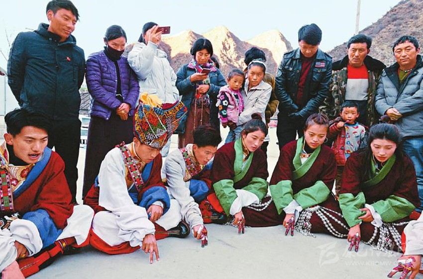 2017年12月22日,白玉縣城陽光普照,縣藝術(shù)團一群“90后”藏族演員用顏料相互在食指和中指上熟練地繪制著具有當(dāng)?shù)孛袼滋厣娜宋飯D案。音樂響起,演員們的手指隨著節(jié)拍翩翩起舞,左挪右轉(zhuǎn)。隨著唱詞和曲調(diào)的變化,手指的動作幅度和節(jié)奏也隨之變化。藝人的情感起伏、喜怒哀樂被“小人”般的手指表現(xiàn)得淋漓盡致。