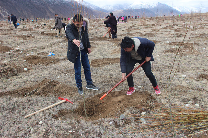當(dāng)天早上10時(shí)許,洛須鎮(zhèn)正科鄉(xiāng)曲德村的植樹現(xiàn)場一派熱火朝天的景象。參加植樹的人們,個(gè)個(gè)熱情洋溢、干勁十足。有的拿鐵鍬,有的提水桶,有的栽樹、蓋土……每一道工序都嚴(yán)格按要求進(jìn)行。兩個(gè)小時(shí)后,一排排樹苗整齊地佇立在藍(lán)天下,就像列隊(duì)整齊等待檢閱的士兵。