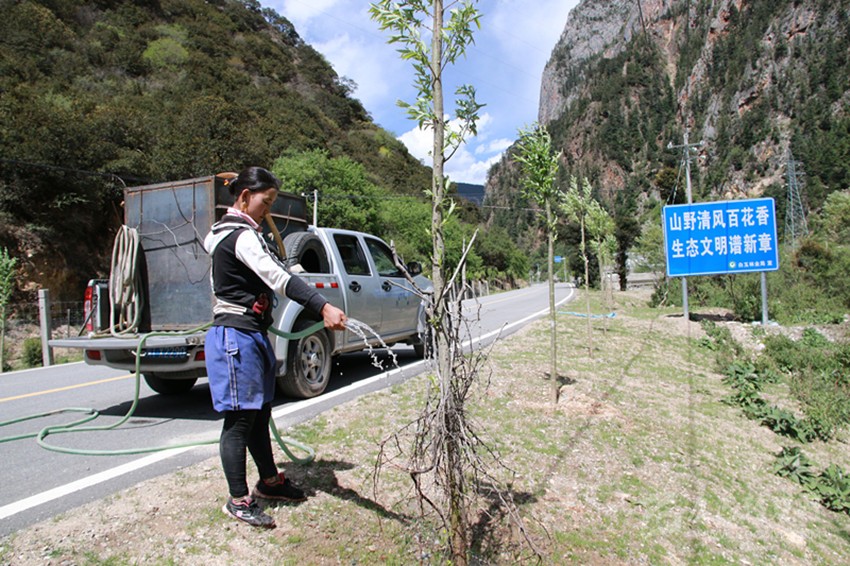 植樹容易,保持存活率很難?!爸矘渲矘?,一分栽九分管。我們植樹造林不只看數(shù)量,更注重質(zhì)量,注重栽植方法和科學(xué)的后期養(yǎng)護(hù)管理,保證樹木的成活率。”6月11日,在白玉縣絨蓋鄉(xiāng),長(zhǎng)江造林局駐白玉管護(hù)站站長(zhǎng)梁榮忙著進(jìn)行現(xiàn)場(chǎng)管護(hù)技術(shù)指導(dǎo),“把遮陽(yáng)網(wǎng)裹緊點(diǎn)、把刺巴綁緊點(diǎn),以免牛和馬啃皮子;水要澆透,不然水分不夠,樹子一斷水,再想‘返陽(yáng)’就難了;護(hù)欄水泥樁要栽牢,不然牛馬一撞就倒了……”。