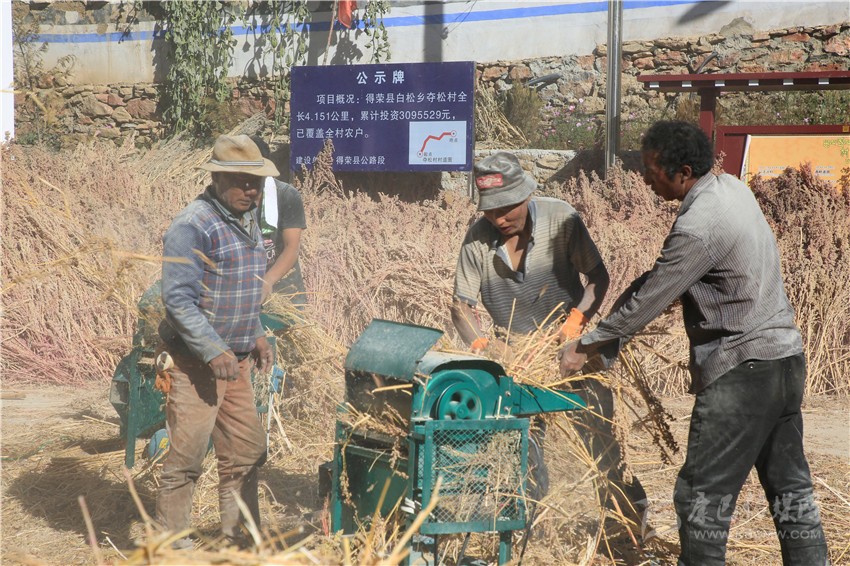 金秋的陽光熾熱溫暖,得榮縣白松鎮(zhèn)奪松村一片祥和安寧。11月10日,村民們正在村活動室的院壩里脫粒藜麥,豐收的喜悅寫在忙碌的村民的臉上?!按蠹壹佑透桑艳见溄唤o公司,立馬可以拿到現錢?!眾Z松村委會副主任四郎都遷高興地說,盤點收成,今年又是一個豐收年。