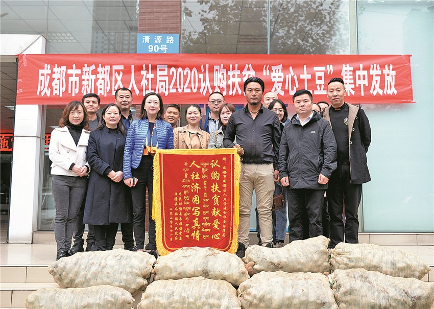 “感謝你們幫助認(rèn)購3萬余斤土豆……扎西德勒!”11月6日上午8點(diǎn)36分,“愛心土豆”車隊(duì)剛在新都區(qū)人社局停車場停穩(wěn),降央吉村一個(gè)躍步下車,為等候多時(shí)的人社局送上“認(rèn)購扶貧獻(xiàn)愛心、人社濟(jì)困寫真情”的錦旗。