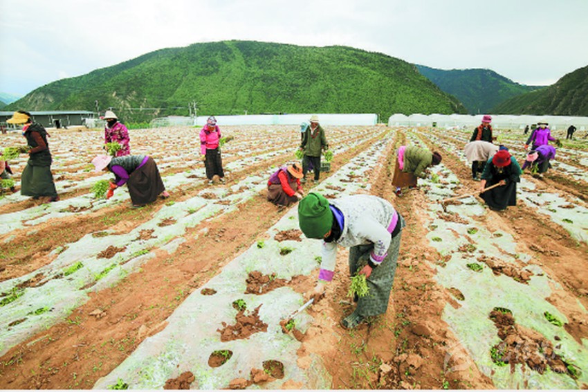 圖為農(nóng)牧民在千畝有機蔬菜、藥材種植示范基地務工。 楊成龍 攝