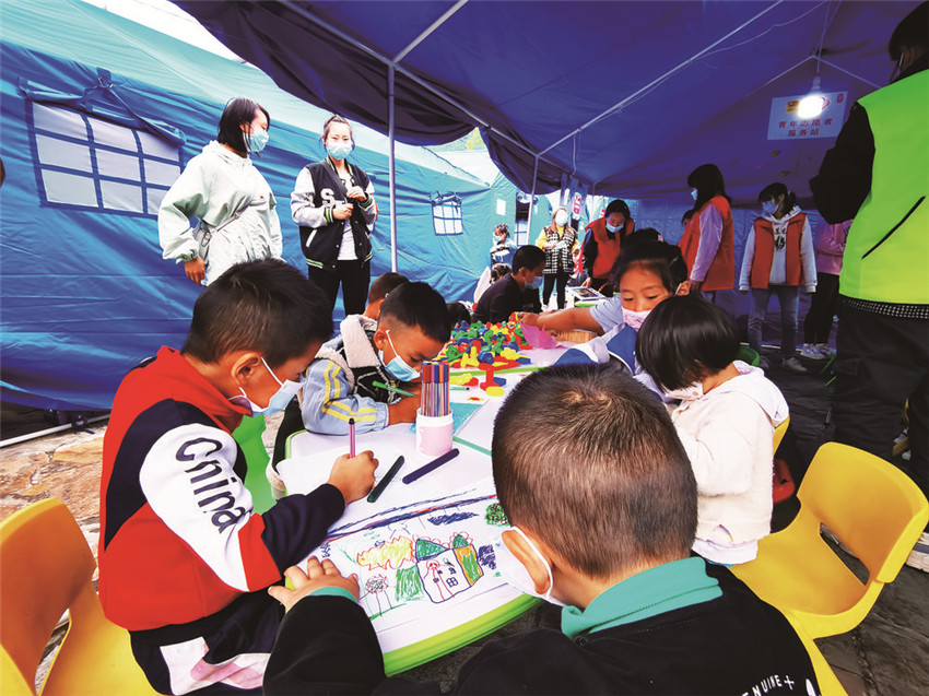 “這頂帳篷中充滿了孩子們的歡聲笑語,這在地震災(zāi)區(qū)就是最動聽的聲音。”共青團甘孜州委統(tǒng)戰(zhàn)社會聯(lián)絡(luò)部部長澤仁娜姆介紹,地震發(fā)生后,團州委第一時間組織3193名志愿者,24支青年突擊隊參與應(yīng)急志愿者工作,并在磨西鎮(zhèn)貢嘎廣場分配38名志愿者參與后勤保障工作,其中5個人便成為了“青青兒童樂園”里的“保育員”,“孩子們可以在這里畫畫、做游戲,還能在老師輔導(dǎo)下學(xué)習(xí),他們不安的情緒也得到安撫,臉上的恐懼也逐漸被微笑取代?!?/p>