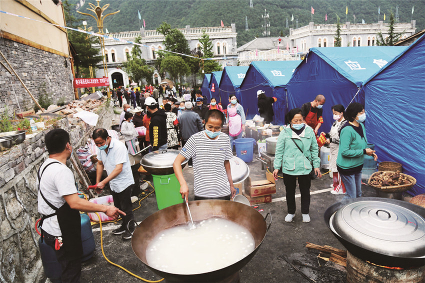 這是來(lái)之不易的“百家飯”,在“9·5”瀘定縣6.8級(jí)地震發(fā)生后,受災(zāi)村民你拿一袋米、我提一筐菜,你出一份力、我捐一點(diǎn)錢,齊心協(xié)力、共渡難關(guān),520人共煮一鍋“團(tuán)結(jié)飯”。