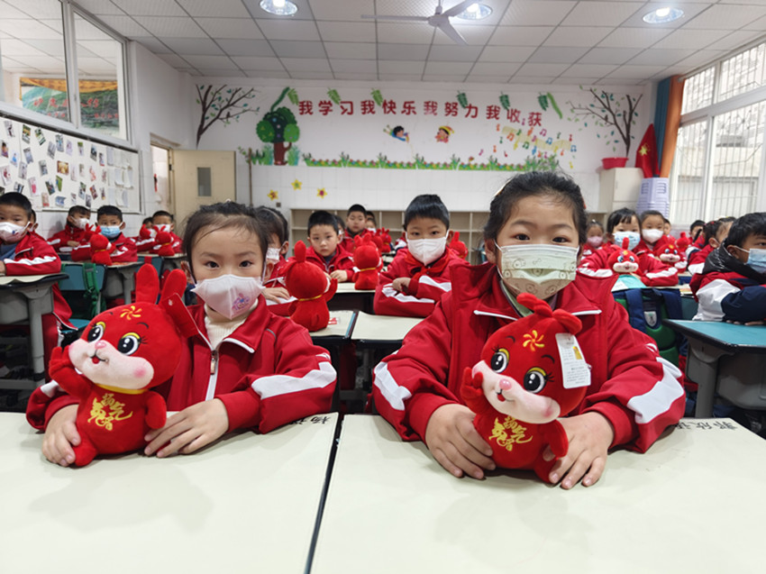 記者注意到,整個校園及各班教室都布置了精美的迎新文化墻,上面張貼懸掛著學生們在寒假生活中制作的主題創(chuàng)意海報。教室內(nèi),每張課桌上不僅插著寫滿祝福語的彩色氣球,還擺放著用紅絲帶打包好的新課本或一套精美文具或一只兔子玩偶,亦或是棒棒糖、旺仔牛奶等零食,均寓意新學期大吉大利、越來越棒、大展鴻“兔”、“兔”飛猛進。“這些別出心裁的小禮物,能給孩子們留下一個美好的記憶點,在給學生們帶來驚喜的同時,也送上一份最美、最真摯的新學期祝福!”教師黃宇虹說。