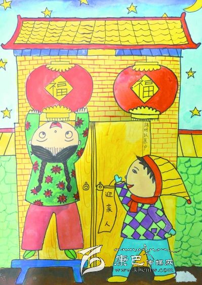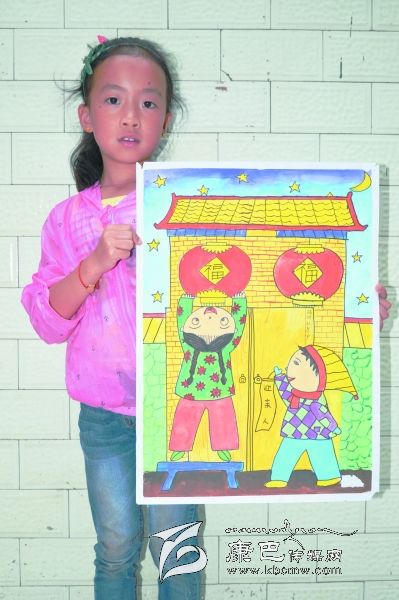 “我和弟弟迎親人”是瀘定縣成武小學(xué)二年級學(xué)生,周靖蕓同學(xué)有感于阿婆家中常有結(jié)對認親干部來走訪關(guān)心而作的畫。據(jù)小朋友自己說:她畫的房子是她阿婆家,掛燈籠的女孩是自己,拿‘迎親人’條幅的是弟弟,畫星星是認親干部有時晚上也會到她阿婆家。(王可富 攝影報道)